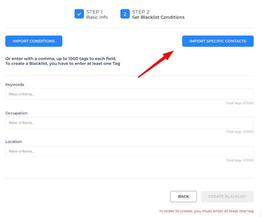 You can also import Blacklist Conditions from a .csv file. Just make sure the headers have keywords, occupation and location.